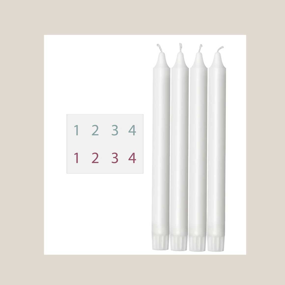 Die 4 weißen Kerzen „Winter Stories“ mit Zahlen sind für den Advent ein schönes und durchdachtes Set, das die Tradition des Advents in Dein Zuhause bringt. Dieses Set enthält 4 Stabkerzen und 8 Aufkleber (Nummern 1-4 in Merlot und Grün), sodass Du den hübschen Kerzenständer für die 4 Adventswochen "personalisieren" kannst. Die Kinder lieben die spannende Wartezeit bis Weihnachten.