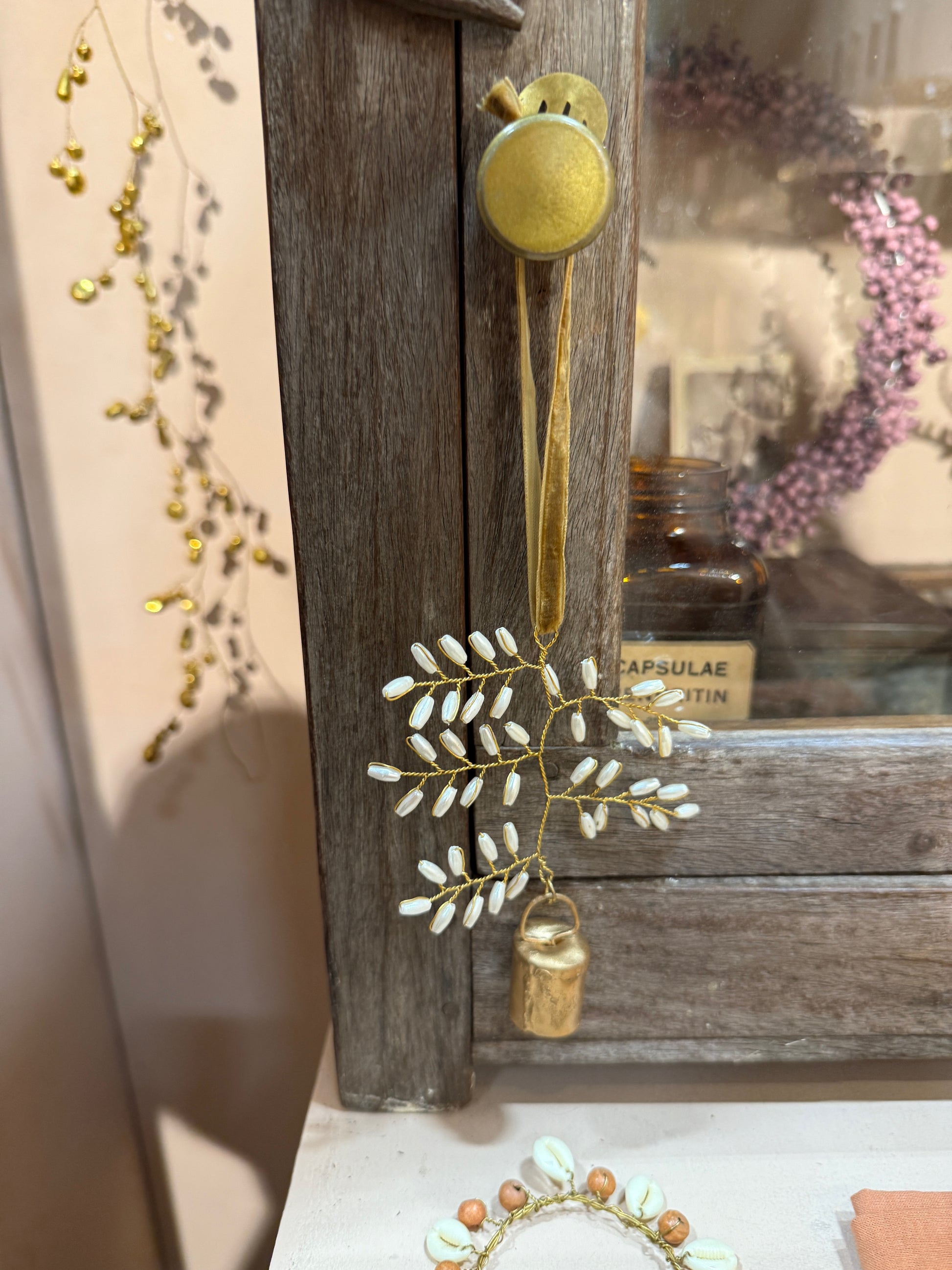 Die goldene Glocke aus Messing ist nicht nur dekorativ, sondern klingt beim Schütteln sanft – ein Detail, das sie besonders macht. Sie hängt an einem kunstvoll geformten Zweig aus goldenem Draht, an dem fünf kleine Abzweigungen mit weißen Perlen sitzen. Das Design erinnert an einen stilisierten Winterzweig voller zarter Beeren.