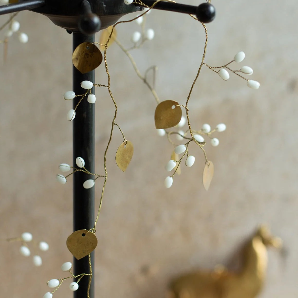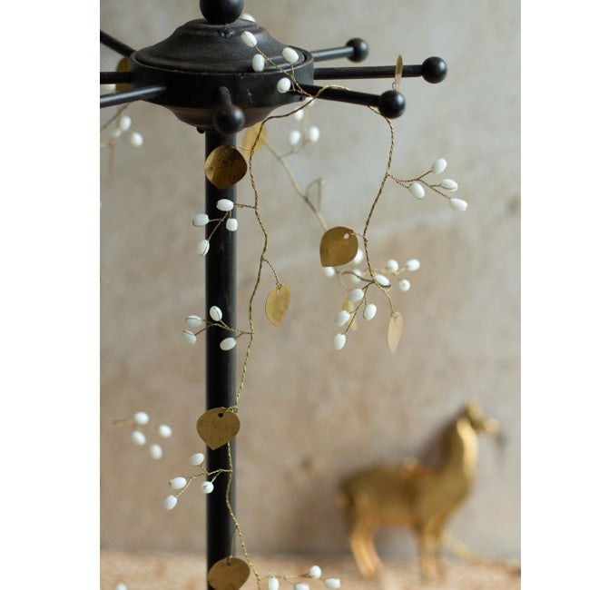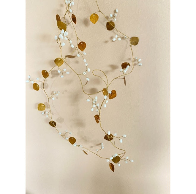 Diese Girlande ist ein echtes Highlight für deine Herbstdekoration. Von Hand aus feinem Messing gefertigt, verzaubern die zarten Blätter und schimmernden weißen Glasperlen dein Zuhause und schmücken jeden Raum.