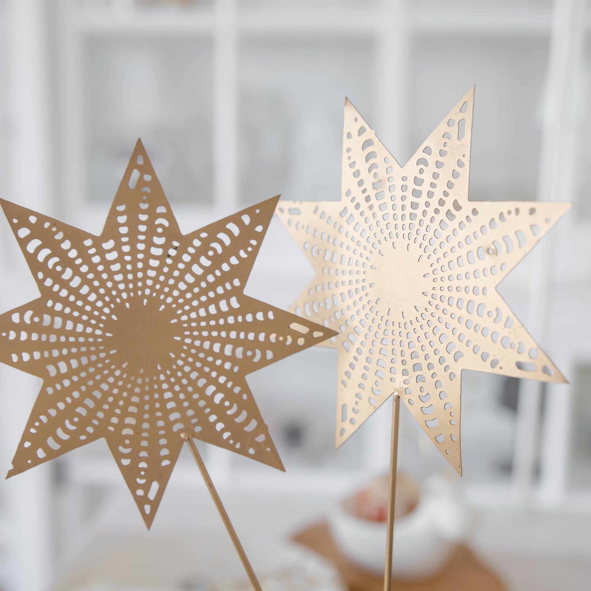 Der Stern für den Adventskranz ist ein Dekostecker aus dünnem, goldenem Messing. Der hübsche Stern hat einen stabilen Dorn zum Stecken und sieht zum geschmückten Adventskranz unheimlich festlich aus. Dann reflektiert das Kerzenlicht in dem Messing und gibt ein gemütliches Licht ab.