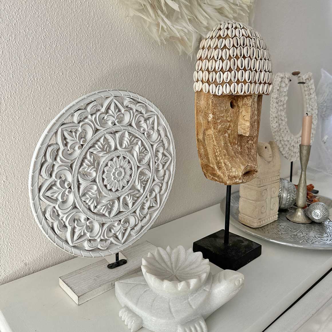 Figuren eignen sich ganz besonders, um deinem Zuhause eine charmante Lässigkeit im Boho Style zu verleihen! Unsere von Hand angefertigten Holzmasken aus Bali, insbesondere die Cowrie Maske M, sind echte Unikate, die mit ihrer Herkunft eine faszinierende Geschichte erzählen. Cowrie ist übrigens der Name der Muschelart, die hier verwendet wird.
